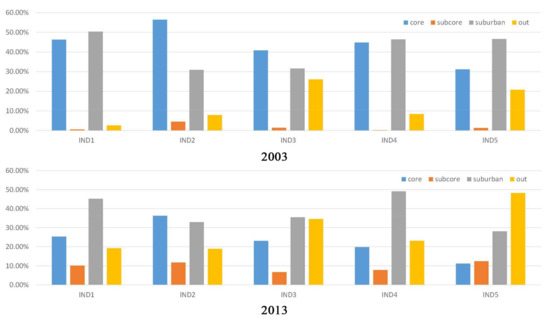 Differences also exist among industries (Figure 6). Industries, such as Transportation, warehousing and postal services, that do not require face-to-face communication diffused the fastest, whereas industries that are heavily dependent on face-to-face communication and customers’ personal business, such as Finance and insurance services, tend to be concentrated in central areas. The industry with the largest proportion of distribution in the central areas is Finance and insurance services, the largest in near areas is Scientific and technical services, and the largest in sub-center areas and peripheral areas is Transportation, warehousing and postal services. Transportation, warehousing and postal service’s relative suburbanization level is the highest, whereas Scientific and technical services diffuses the fastest. The proportion of Rental and business services distribution in near suburban areas exceeds central areas, and the proportion of Transportation, warehousing and postal services distribution in the periphery goes beyond the central areas and near suburban. The industry with a proportion in the central areas decreasing the fastest is Scientific and technical services, the industry with proportion in the sub-center increases the fastest is transportation, warehousing and postal services, and the industry with a proportion in the peripheral areas decreasing the fastest is Transportation, warehousing and postal services.