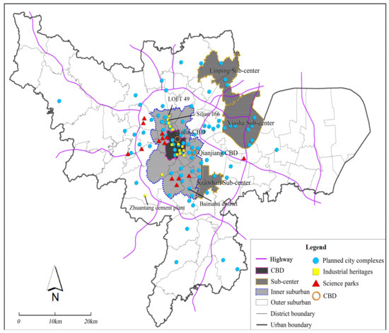 Distribution map of city complexity (planned), industrial heritage, and science parks.
