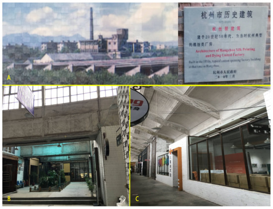 Agglomeration area of Silian 166 creative design service sectors. (A) Hangzhou Silk Printing and Dying United Factory in the 1950s; (B,C) reconstucted Silian 166 Creative Industrial Park.