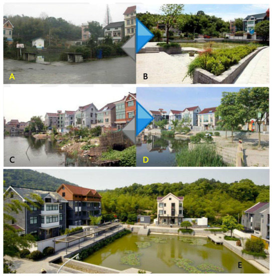 Hangzhou Baimahu Nong Ju (Small Office/Home Office) SOHO creative industrial park. (A,C): villages’ residential buildings before the reconstruction; (B,D,E): creative industrial park after the reconstruction.
