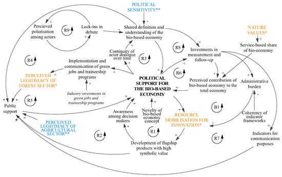 | “What if industrial investments in green jobs traineeship programs were enabled?” | Investing in and communicating these activities would make the perceived legitimacy of the forestry sector increase, ultimately supporting a broader shift to a bio-based economy through a build-up of public and political support. | The “Shared definition and understanding of the bio-based economy concept” (the more developed the shared definition and understanding, the higher the public and political support for the bio-based economy) | What other measures can be taken to recognize societal values and ensure that forest management practices are aligned with these? Are negative attitudes towards mono-cultures predominant also for species other than spruce and pine (e.g., willow)? | |