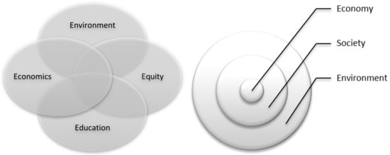 At the institutional level, modern understandings of sustainability generally begin with the Brundtland Commission definition: Sustainable development is the development that meets the needs of the present without compromising the needs of future generations [17]. It describes sustainability as comprising an intersection of three elements: the environment, the economy, and equity. The premise is that all three elements must be preserved, and that any one element cannot be promoted at the expense of the others; sustainability is achieved when these are balanced. Sometimes, a fourth “e”, education, is added, reflecting the importance of community buy-in. Others argue that the relationship between elements is hierarchical, with the environment paramount, and thus best depicted as concentric circles, as shown in Figure 1. There are also a great many other definitions and conceptualisations.