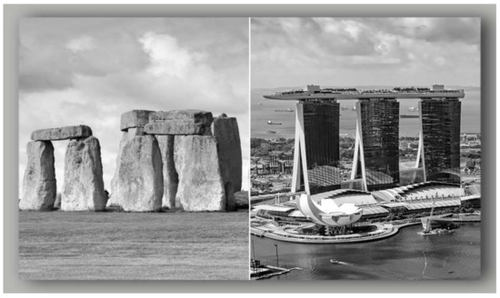 Serious architects, unlike construction managers, engineers, or perhaps any other professional, are prone to speak of their work in conceptual terms. Any respectable architecture program at university level will have a history and theory component. Styles from the ancient Classical, Romanesque, Norman, and Gothic; through Mannerism, the Baroque, Georgian, Victorian; to the Modernism, Bauhaus and International movements of the last century, all in their turn capture a “zeitgeist”, or spirit of the age in which the aspirations of human civilisation are immortalised in the built form. The commonalities linking architectural forms speak to the perennial boundedness of the human condition: the need for shelter and for spaces to carry out both the mundane activities of everyday life, as well as the ceremonies and rituals that lift the soul. The differences between these forms speak to the evolutionary nature of human progress and the iterations in our efforts to lift ourselves into a better tomorrow. The comparison of architectural images, such as the two shown in Figure 2—Stonehenge, United Kingdom (UK), and the Marina Bay Sands Resort, Singapore—is an activity familiar to architects. What would they see? There is of course the remarkable technological differential that separates the 3800-year divide in construction dates. Yet, that divide is bridged in the realisation that the makers of both structures shared a driving ambition to impose their will on the landscape and bring their architectural vision into reality. The gesture of lintel and columns that are so evident in both structures would not be lost on Jungian psychologists, nor indeed on architects themselves.