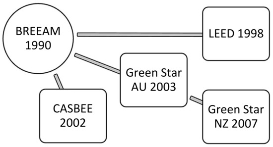 Given the ingredients of a recent but rocketing concern over the environmental impact of the built environment, combined with a regulatory legacy steeped in off-plan compliance assessment and a culture of outsourcing assessment to commercial bodies vying in an open market, we have fostered the emergence of the competitive green-rating assessment regimes that we see today. Just as with any fast-growing market for a new high-demand product, green building rating tools have exploded onto the scene, with a plethora of providers offering all sorts of rating tool variations. At last count, there were over 600 such sustainability rating tools competing in the market [42]. Similar to any emerging market, the market for green rating tools is characterised by early entrants that have captured market share, followed by niche entrants that have tweaked initial offerings to serve specialist sectors or adapt to different regional conditions. The Building Research Establishment Assessment Method (BREEAM) dominates Europe, the Leadership in Energy and Environmental Design (LEED) is preeminent in America, the Comprehensive Assessment System for Built Environment Efficiency (CASBEE) is centered on Asia, and Green Star is the main provider in Australasia. A schematic of their evolutionary development is shown in Figure 5.