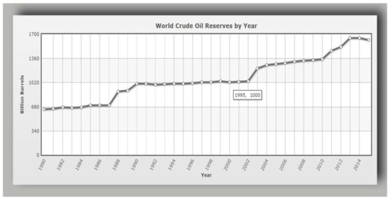 - United States Energy Information Administration. World Crude Oil Reserves by Year. Available online: https://www.indexmundi.com/energy/?product=oil&graph=reserves (accessed on 23 March 2018).
