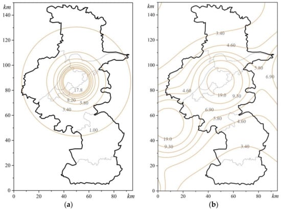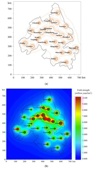 Based on the formula of consumption field strength under an n-field source, Equation (5), once the agritourism coefficient ka, the coordinates of city center points, and their agritourism consumption demands are given, the field strength distribution of agritourism consumption can be determined. The agritourism coefficient can be determined by the equation , where Mi is the income of agritourism in the ith peri-urban space, Si is the area of the ith peri-urban space, and is the sum of the agritourism income and the peri-urban area ratio. Once the agritourism income and peri-urban area are specified, the agritourism coefficient can be determined.