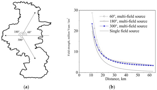 Although the trend that field strength of agritourism consumption under multifield sources varies with distance is generally similar to that under a single field source, the decay rate under multifield sources tends to slow down slightly in different directions. In addition, due to superposition of multifield sources, the spatial distribution of field strength is no longer in the fashion of concentric circles, but an uneven distribution of contour lines.