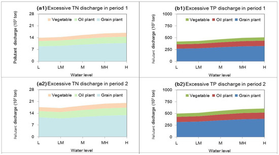 In study region, the overextended farming and irrational fertilization would generate excessive TN and TP pollutant discharges, which would bring about great stresses on regional environment. Thus, policymakers have regulated the maximum pollutant allowance according to regional environmental carrying capacity. Figure 4 shows excessive pollutant discharges without market approach when μ is 0.6. Several sensitive parameters of pollution discharge without market approach can be obtained, where water flow level, crop planation scale and corresponding pollutant discharge rate would influence the excessive pollution discharges. (a) Various water levels can generate changed capacities of pollutant diffusion. In general, a higher water availability level can produce a higher diffusion capacity. However, after more available water is allocated to irrigative activities, more pollutant would be discharged due to over-fertilization. For instance, when water levels are low and high in Period 3, the excessive TN from grain plant would be 12.01 and 14.32 × 106 ton, respectively. (b) The results determine that the crop planation scale and corresponding pollutant discharge rate of varied crop planation can generate different amount of pollutant discharge. Meanwhile, various policy scenarios associated with changed allowable discharges can be considered. In the study region, based on calculation of environmental loads, policymakers have restricted maximum allowances ( and ) for TN and TP discharges. The results indicate that looser allowance would bring about a lower excess discharge, and vice versa.