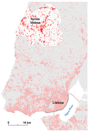 Torres Vedras municipalityis located roughly 50 km north of Lisbon (Figure 1), and it was selected as the study area to conduct this research. The population density in 2011 was 195 inhabitants per sq. km [32]. Torres Vedras is mainly covered by agricultural and forest land, and has been driven by urban pressure over the past two decades. Between 1995 and 2010, artificial surfaces increased by 41% [33].