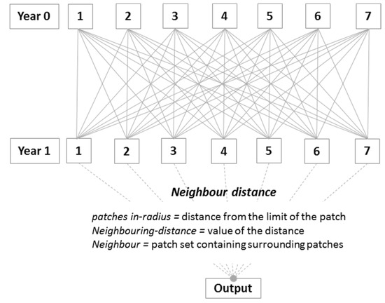 In our research, we measured the influence of neighbouring distance for new artificial surfaces in year 1 counted from the edge of artificial surfaces that had existed in year 0; we then verified in which non-artificial areas of year 0 (non–irrigated arable land, permanently irrigated land, permanent crops, pastures, heterogeneous agricultural land, and forest) these changes had occurred. Neighbouring distance was estimated for each 10 m, and up to 200 m.