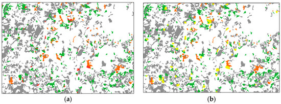 (a) Extract of the LAND method running. Example Figure (a): LUCC between pastures-1995 (year 0-state 1) and artificial surfaces–2010 (year 1-state 2). Each colour represents one state. Red means: changed state 1 to state 2; orange: maintained state 1 as state 1; green: changed state 1 to other states; white: other states that have maintained their class and become stable states; and grey means: changed other states to other states; (b) shows the neighbours (50 m distance) in LUCC between pastures-1995 (state 1) and artificial surfaces–2010 (state 2).