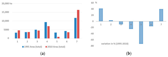 (a) Total area (in hectares) by land use class in 1995 and 2010; (b) variation (in %) by land use class between 1995 and 2010. Land use classes: 1—artificial surfaces; 2—non-irrigated arable land; 3—permanently irrigated land; 4—permanent crops; 5—pastures; 6—heterogeneous agricultural land; and 7—forest.