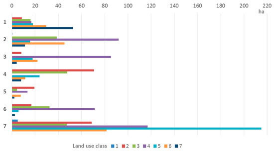 Land use transitions between 1995 and 2010 (by each land use class–in ha). Land use classes: 1—artificial surfaces; 2—non-irrigated arable land; 3—permanently irrigated land; 4—permanent crops; 5—pastures; 6—heterogeneous agricultural land; and 7—forest.