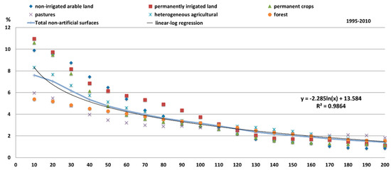 LUCC (in %) from non-artificial surfaces to artificial surfaces, and linear-log regression in the areas of urban growth from 1995 to 2010 according to distance from existing built-up areas.