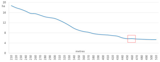 As shown in Figure 8, we have demonstrated the spatial continuity that links the new urban areas with the existing ones and an increasing trend towards the compactness of built up areas (patches) with the 10 m section zone. Every 10 m, from 0 to 200 m, the proportion of new artificial surfaces always decreased with distance. We had to estimate the new built up areas every 10 m up to 500 m from the existing ones to identify a ‘return point’ (albeit a slight one), i.e., an area (in distance) where the new built up areas were more than in the previous ones. This was verified at 460 m in the stabilisation phase (Figure 8).