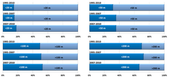 In the 1995–2007 time period, the highest percentage of new urban areas was found less than 200 m from existing ones, when compared to the 2007–2010 period (72.2% and 64.4%, respectively). However, when we analysed new artificial areas closer to the edge of artificial surfaces that had already existed in year 0, we saw greater urban contiguity in the 2007–2010 period. In the 1995–2007 time period, 32% of new urban areas emerged in the first 50 m of existing urban areas, and 35% in the 2007–2010 period (Figure 10).