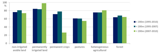 Figure 11 illustrates the percentage of land use classes that changed from forest land to artificial surfaces. Permanently irrigated land lost more ha in the area that was less than 200 m from existing artificial surfaces. Permanent crops lost 26.3% in 2007–2010 in the areas that were less than 200 m. However, in the 1995–2010 period, permanent crops lost 73.7%.