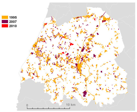 To analyse the evolution of non–artificial surfaces to artificial surfaces, we compared the situation in the three time periods: 1995–2010, 1995–2007, and 2007–2010. Figure 9 shows that the urban growth trend is similar, with the highest growth rate occurring closer to existing urban areas.