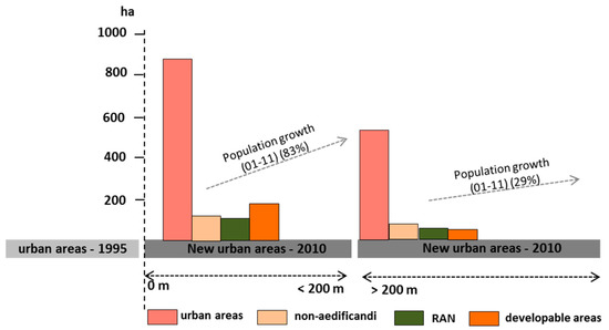 Developable areas defined as future urban development in the Master Plan were classified as urban areas between 1995 and 2010, 168 ha less than 200 m, and 56 ha more than 200 m from the edge of existing urban areas (which corresponds to 8.5% of the total developable areas as defined in the Master Plan) (Figure 13).