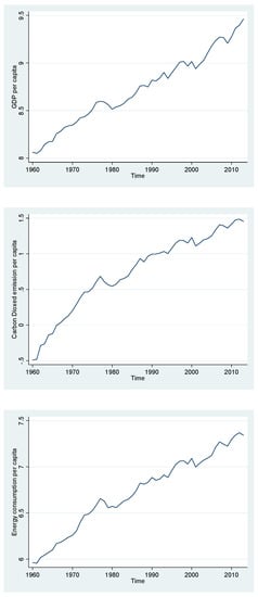 where is the energy consumption per capita, while the other variables are defined in Equation (11). Thus, this is merely an extended version of the Kuznets curve where energy consumption is added. Energy consumption is added in the above-mentioned paper since it has a considerable impact on environmental degradation. A focus on reducing per capita energy consumption is considered to be an effective method for decreasing carbon dioxide emissions; therefore. e.g., Asperigis (2016) argues that the variable should be included when estimating the EKC. The data covers the time period from 1960–2013. The procedure is identical to that of the Kuznets curve, where we used a unit root test and a cointegration test to establish that a linear combination of the variables is stationary, and then the DOLS and the new Ridge DOLS estimator to estimate the coefficients of Equation (12).