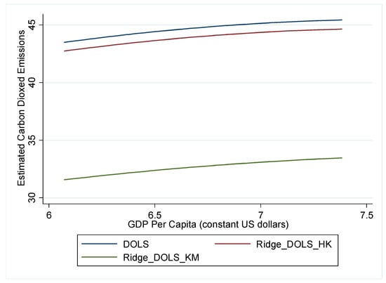 The EKC. Note: DOLS is the dynamic OLS estimator. Ridge_DOLS_HK is the Hoerl and Kennard [9,10] estimator and Ridge_DOLS_KM is the Kibria [11] estimator.
