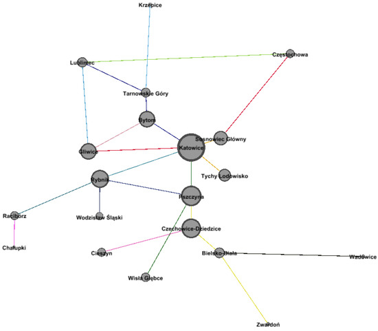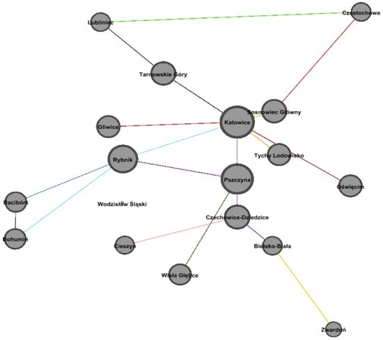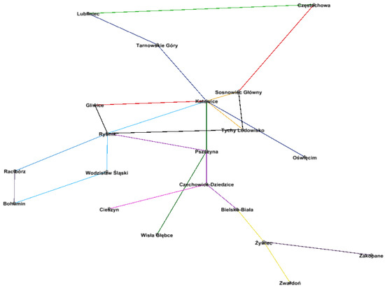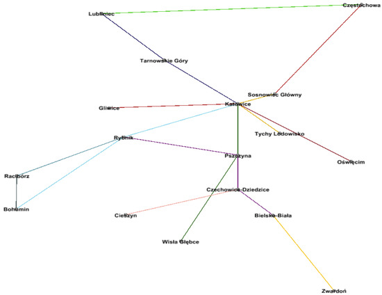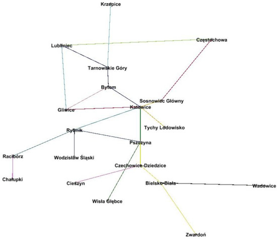 Network analysis methods have been used for several years now, whether to analyze social systems [32,33,34], or to analyze neuron systems [35,36,37], biological systems [38] and computer systems [39]. This was a result of considerable mathematical development of these methods. The possibilities of analyses carried out with the use of the graph theory are also presented in [40]. According to [40,41,42,43,44,45], the same methods and coefficients which have been successfully applied by sociologists in the analysis of social systems can be now used to analyze transportation networks. [41] contains a comparative analysis of three types of systems which, in terms of parameters, correspond to actual networks. An analysis of their immunity to disturbances was also conducted. In turn, [42] includes an analysis of transportation networks in Poland, assuming three different branches: air transport, railway transport and road transport.