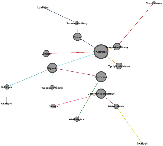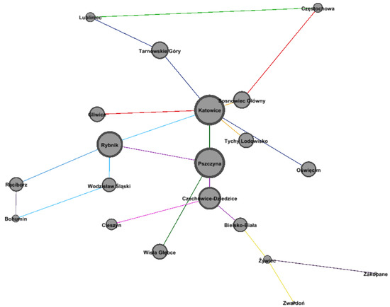 There are many methods of designing transport infrastructure. Methods applying dynamic modeling (as exemplified by the graph theory) have recently become very popular. In the case of dynamic modeling methods, when selecting the sites to locate transportation facilities, all types of fluctuations of source data concerning, among others, mobility patterns, the sizes of transit streams, transit costs and environmental damage are taken into account [30]. Hence the modeling of transportation infrastructure in the region is completed by modeling a network comprising various branches of public transportation (applying network profile measures and the properties of complex networks and IT systems). The development of a modeled transportation system is supported by public campaigns promoting sustainable mobility, i.e., abandoning private cars in favor of mass transit (particularly railway transport) [31]. Management of these campaigns is an element of the overall management of public transportation utilizing ITS.