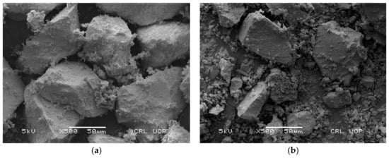 As discussed earlier, specific surface area is yet another very important parameter of pozzolanic activity. When ashes are ground, their particle size reduces, and thus specific surface area increases. The results of Blaine fineness are shown in Table 4. It can be observed that up to 30 min of grinding there is an insignificant increase in Blaine surface area of just 11% with respect to WSA before grinding, while an increase of 28% is observed in Blaine surface area after 60 min of grinding. The micro morphology of WSA ground after 60 min shows significant breaking of particles (Figure 9a). The WSA60 shows coarser quartz particles, which are identified by their conchoidal fractures [71]. Due to the breakage of particles up to 60 min of grinding, the Blaine surface area has increased. The increase in surface area after 120 min and 240 min with respect to WSA without grinding is 48% and 68%, respectively. As the grinding duration increases, the grains break down further due to the mechanical action of the grinding media, resulting in increased fineness of the material [72]. This is observed in (Figure 9b,c), in which WSA120 shows a heterogeneous mixture of large number of finer and few coarser particles. In WSA240, the amount of finer particles has increased even more. Increased specific surface area helps in pozzolanic reaction by providing more nucleation sites for precipitation of the reactants, and thus enhancing the rate of pozzolanic reaction [73]. Similarly, small particles of ground WSA can fill the voids or air spaces in the cement/concrete structure and thus can produce denser concrete. This is referred to as the filler or packing effect [74]. The percentage increase in surface area for WSA120 with respect to WSA60 is approximately 16%, while the percentage increase in surface area for WSA240 with respect to WSA120 is approximately 13%. The decrease may be related to the inherent difficulty in grinding fine particles associated with their strength, low capture probability, and their tendency to agglomerate [75]. It is important to point out here that the grinding technique adopted in this research did not result in significant increase in Blaine surface area as compared to other studies reported in literature. For example, Cordeiro et al. [73] reported an increase of 510.47% after grinding SCBA for 240 min. The SCBA without grinding had a Blaine surface area of 1960 cm2/g, while after 240 min of grinding, the surface area of SCBA increased to 11,970 cm2/g. Similarly, Xu et al. [76] ground the RHA from 5 min to 120 min and found that Blaine surface area increases up to 30 min (19,558 cm2/g), and then it started decreasing. The authors found that this was due to the agglomeration of RHA particles due to excessive grinding duration. The difference in results is due to the reason that the ball mill used in this research had a speed of 66 rpm, due to which no tumbling motion of the grinding media was observed, which is very important for efficient grinding [44].