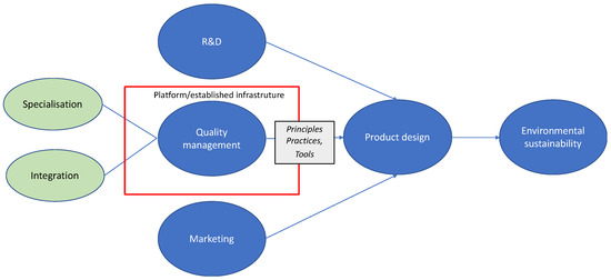 Sustainability has been conceptualized in relation to types of competencies that are necessary for managers engaged in sustainable management practices [44,45]. To make such categorisation more “meaningful” and to operationalize these competencies, they must be connected to “core tasks” in the organisation [45]. In doing so, this study explores the intersection of QM, product development, and environmental sustainability, as illustrated by two alternative approaches to organising sustainability competency: specialisation and integration. In this study, the integration of competency refers to situations in which an expert in QM and product development also includes environmental sustainability into his/her portfolio. Here, the same individual internalises environmental sustainability with the principles of QM. In contrast, the specialisation of competency views sustainability as an area of expertise that is organised by assigning the role of sustainability to one individual expert, who then interacts with other functional experts in QM and product development.
