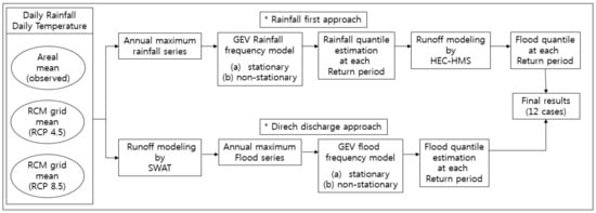 In South Korea, the length of measured discharge data is too short to directly analyze the flood quantiles at each return period. Therefore, the rainfall frequency analysis is firstly performed to calculate the design rainfalls at each return period. Then, the calculated design rainfall is applied to the rainfall-runoff model to estimate the design flood. However, this approach has the disadvantage of using the assumption that the return periods in rainfall and flood are the same. Therefore, the results between this approach (hereafter, rainfall frequency first approach) and the direct flood frequency analysis, which directly uses discharge data (hereafter, direct discharge approach), are compared under stationary or non-stationary flood frequency models using the observed data and the annual maximum rainfall data from RCP 4.5 and 8.5. Figure 1 shows the flowchart of this comparative study.