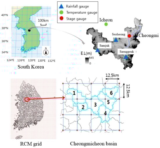 The Cheongmicheon watershed is selected because the water resources management plan preventing flood and drought has been newly developed after Restoration of Four Major Rivers Project funded by South Korea government. The longitude and latitude of this watershed are 127°20′~127°44′ E, and 37°60′~37°84′ N, respectively. The total length of main channel is 60.8 km and the area is 596.60 km2. The mean altitude of the watershed is approximately E.L. 141.38 m, while the altitude of most area lies between E.L. 50 m and E.L. 100 m. The mean gradient is 17.0% with 676 m of the peak altitude. The hydrological soils are categorized as A, B, C, and D by the NRCS method. A type and B type, which are comparatively well drained, account for 5.4% and 33.7% of the total area, respectively, whereas C type and D type, which are comparatively badly drained, account for 17.3% and 43.5% of the total area, respectively. Figure 2 shows the study watershed, which consists of six sub-basins. In this basin, three rain gauges (Seolsung, Samjuk, and Saenggeuk), one temperature gauge (Icheon), and one stage gauge (Cheongmi) are operated.