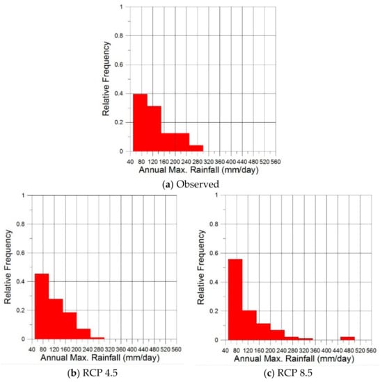 The annual maximum rainfall data sets to the observed and future climate scenarios (RCP 4.5 & 8.5) are shown in Figure 3. Also, Figure 4 and Table 3 show the statistical differences between the observed and the future annual maximum daily rainfall data sets. The probability density of RCP 8.5 is significantly different from those of the observed and RCP 4.5, because the skewness of RCP 8.5 is much larger than others. Also, the probability densities of the observed and RCP 4.5 are similar, but the mean of the observed data is 15.4 mm larger than that of the RCP 4.5.