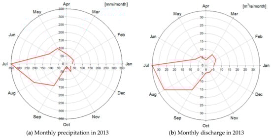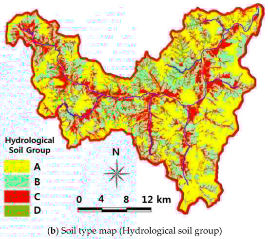 HEC-HMS model is used for the rainfall frequency first approach and SWAT model is adopted for the direct discharge approach. In this study, the case in 2013 is selected to calibrate the parameters using the SWAT model. Figure 5a,b show the land cover map and the soil type map using hydrological soil group by NRCS in the Cheongmicheon watershed. Also, Figure 6a,b represent the monthly precipitation and discharge in 2013. The annual precipitation of the Cheongmicheon watershed in 2013 is 1288 mm/year, while the national average in the Republic of Korea is 1163 mm/year during the same period. 55% of the annual precipitation is concentrated in summer (June to August), while 27% is concentrated in July alone. The annual average discharge is 11.3 m3/s. The greatest monthly discharge occurred in July and the annual maximum daily precipitation is 70 mm, recorded in July. The number of rainy days is 130 and the largest amount of discharge is 157 m3/s.