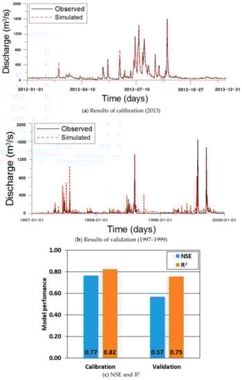 Figure 7a,b are the model results of calibration in the year 2013 and validation in the years 1997–1999. With the optimized parameters, the monthly and seasonal discharges are fitted well to the observed. In addition, the Nash and Sutcliffe efficiency (NSE) [49] and R2 are calculated, as shown in Figure 7c. Given that the closer the two indices are to unity, the more accurate the simulation capability of the model is, the model performances can be concluded to be relatively exact.
