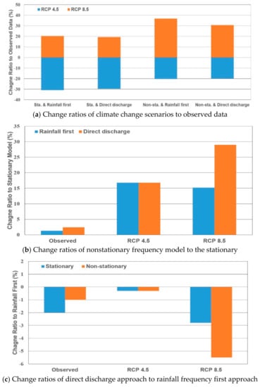 Figure 8a–c show the change ratios to each method. Firstly, in Figure 8a, all of the design floods from the observed data were larger than those from RCP 4.5 and smaller than those from RCP 8.5. Especially, the design flood by the combination between non-stationary frequency model and the rainfall frequency first approach was the highest under RCP 8.5. Therefore, it can be suggested that the design floods from RCP 4.5 are too small to establish the reasonable flood measure in the Cheongmicheon watershed. However, it is very difficult to choose between the design flood from the observed data and RCP 8.5, because RCP 8.5 is a possible scenario in the future. Therefore, it can be suggested that the design floods from the observed data and RCP 8.5 are considered as uncertainty for the effective flood prevention planning.
