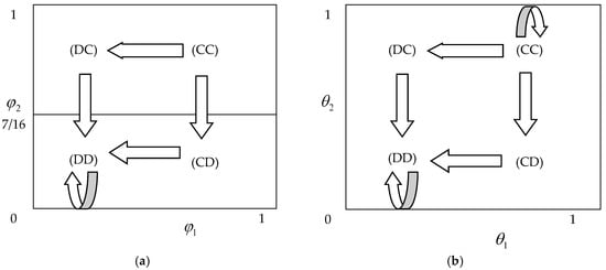 It is easy to observe following three evolution paths from Figure 3. First of all, if the initial competition is DD, the equilibrium will always be stable under this structure both in power setting of MS and RS. Secondly, if the initial competition structure is CD or DD which is unstable, eventually it is possible to reach the stable state of DD with the development of evolutionary game. This result is also valid in both MS and RS game and can be easily deduced from the above Corollaries 1 and 2. Thirdly, if the structure is CC in the beginning, it inevitably evolves toward CD or DC, eventually reaching DD in the MS model, while very stable in the RS model. As a consequence, the steady state of evolutionary game is DD or CC.