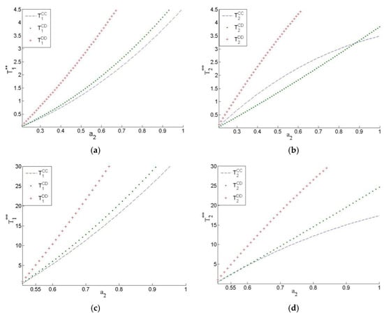 Firstly, supply chain profits gradually increase with . This result shows that the farther the two core enterprises in the Hotelling linear market, the better the two supply chains. It reflects that the spillover effects of the two chains become larger and larger as the degree of competition slows. The first insight is obviously consistent with common sense, that is, under certain conditions, the more intense the market competition, the less profitable the enterprises, but the larger the surplus from the consumer’s point of view.