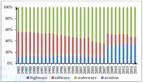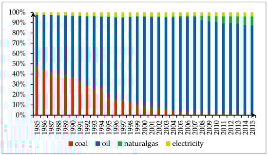 Third, as for the structural adjustment effect, freight transportation structure () presented the third contributor to logistics CO2 increase; this finding is also consistent with previous studies [18,19,28]. From 1985 to 2015, contributed 220.64 million tons, which accounted for 29.92% of the CO2 change. The reason is due to the shift of freight structure during the past decades, and the share of transportation turnover among the four transport modes as detailed in Figure 1. Specifically, the percentage of highways with a higher energy consumption per freight turnover increased remarkably from 9.64% in 1985 to 32.98% in 2015. At the same time, the share of aviation also appeared to have an upward trend, which increased from 0.02% in 1985 to 0.12% in 2015 due to the growing aviation logistics demand for the transportation of fresh products (e.g., flowers, seafood), precision machinery (e.g., the medical machine), business documents, and communication products. However, the proportion of railways decreased between the seventh and the 12th five-year plan periods. Energy structure () played a weak role in inhibiting the increase of CO2 emissions, which can explain about 15.06 million tons or 2.04% of the CO2 changes in the logistics industry. This happened mainly due to the use of clean energy and new energy, as well as changes within the energy structure over the past decades. The energy consumption structure of the logistics industry is shown in Figure 2. During the 1985–2015 periods, the proportion of coal rapidly decreased from 30.38% to 0.97%, a decrease of 29.41%. However, the share of oil has presented an upward trend, which contributed to the increase of CO2 and offset the reduction caused by the coal effect.