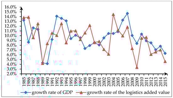 The growth rates of gross domestic product (GDP) and the logistics added value from 1985 to 2015.