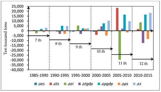 Moreover, this paper further analyzes the decomposition results by five-year plan periods, as displayed in Table 5 and Figure 5. The five-year plan is the plan for the national economy and social development of China launched by the Chinese government. Taking five-year plan periods as intervals can better explain the impacts of the driving factors on logistics CO2 changes over time. Some points were obtained as follows.