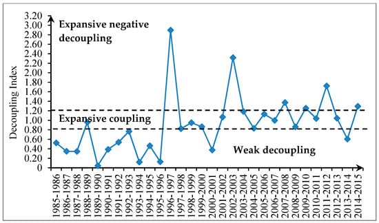 During the past three decades, a weak decoupling state and expansive coupling state occurred in 12 years, respectively, and an expansive negative decoupling state appeared in the other six years, which implies that the development of the logistics industry has had a relatively strong dependence on carbon dioxide emissions. As displayed in Figure 6, the variation of decoupling index from 1985 to 2015 can be divided into three stages.