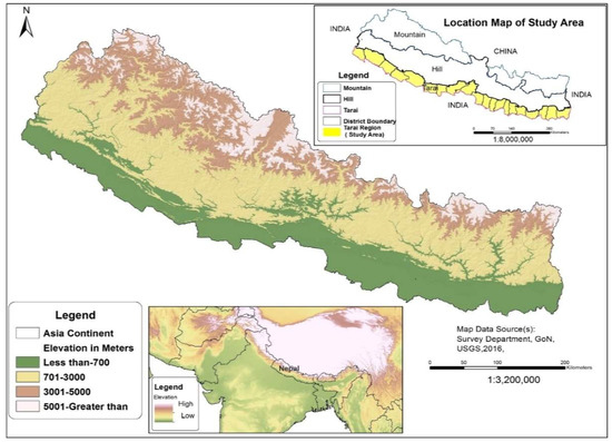 Nepal comprises three geographical regions, namely the High Mountains, Mid Hills and the Tarai region, the latter of which defines our study region. The Tarai region is a fertile low-lying region of Nepal (Figure 1). The region comprises 20 districts with total area of 33,485 km2, which constitutes 23% of the national area. The region has a humid tropical and sub-tropical climate with summer temperatures ranging from 32 °C to 35 °C and winter temperatures ranging from 8 °C to 15 °C, with an average annual rainfall of 270 mm. Tarai has experienced remarkable population growth in recent decades, more than doubling over 1981–2011 from 6.5 million inhabitants (44% of the national population) to 13.3 million (50.3%).