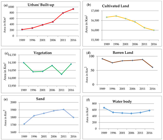 Land-cover change in the Tarai region 1989–2016, by land-cover class, (a) urban /built-up (b) cultivated land (c) vegetation (d) barren land, (e) sand (f) Water body.