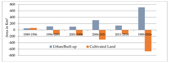 Gain and loss of urban area and cultivated land during 1989–2016, Tarai region, by period of observation.