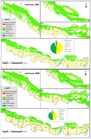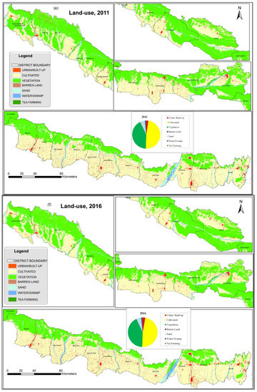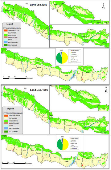 The land-cover classification scheme developed by Anderson et al., 1976 [64] (Table 2) was adopted here, defining eight land-use/cover classes: urban (built-up), cultivated land, vegetation (dense forest, scattered forest, shrub, and grass), barren land, sand area, water body, swamp area and tea plantations (Table 2). LULC transitions rates for the periods 1989–1996, 1996–2001, 2001–2006 and 2006–2011 and 2011–2016 were subsequently derived from the Landsat classifications.