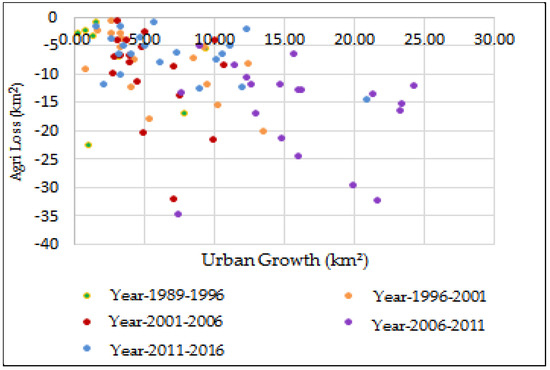 At the district level, the overall relationship between urban growth and agricultural loss over 1989–2016 was linear (Figure 5). This does not conflict with the moderately exponential rate of land-cover change observed at the regional scale (Figure 2), which reflects aerial trends, but it does affirm that agricultural land was the prime source of new urban cover generally. The relationship between urban and agricultural change at the district level is similarly linear across all individual periods of the time series, notwithstanding the fact that earlier periods, characterized by relatively low urban growth rates, are characterized by weaker, more variable relationships (Figure 5). The pattern of urban and agricultural change by district and period in Figure 5 affirms the aforementioned observations of steadily increasing regional rates of change while also highlighting the variable and temporally irregular nature of the urban–agricultural relationships at the local level, via the lack of overlap between data points for 2006–2011 and those of other periods. Inter-district variability in the urban–agricultural relationship probably also reflects differences between flood-prone districts (Bardiya, Nawalparasi, Sarlahi, Saptari, Sunsari and Jhapa (the outlier agriculture loss value for Jhapa district during 1996–2001 (at −71 km2) was omitted from Figure 5 for the sake of graphical interpretability) and others, as cultivated areas in the former districts are frequently transformed into sandy river embankments due to seasonal flooding.