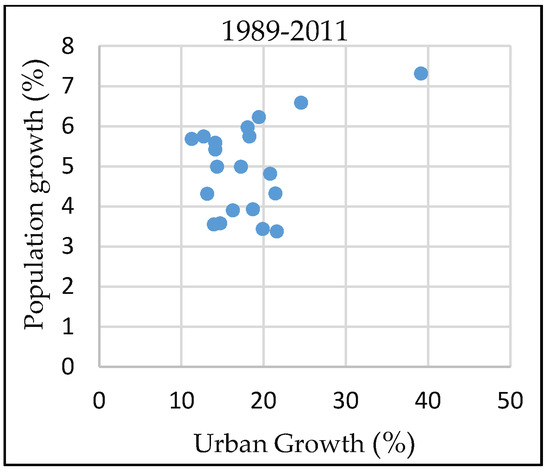 At the district level, the contribution of total population growth to urban growth and, by extension, to local agricultural loss, appears more uncertain. The relationship between population growth and urban growth was highly variable over 1989–2011 at the district scale (Figure 6), precluding reliable generalizations. This regional variability in the relationship between population growth and urban growth highlights the potential for urban-growth management to achieve more consistently reduced rates of urban expansion and agricultural loss despite continued population growth.