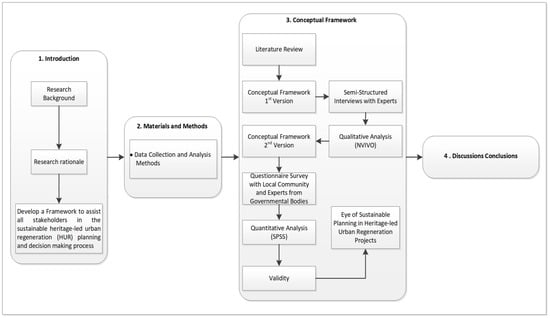The first objective of this research is to discover what are the necessary elements of sustainable planning in heritage-led urban regeneration projects. The second objective is to explore what is the main source of conflict between the local community and professionals in the context of heritage-led urban regeneration planning processes. In order to satisfy these objectives, the layout of the research process to conceptualise and finalise the theoretical framework is given in Figure 1. Then, the survey methods and tools adopted during the research will be explained.