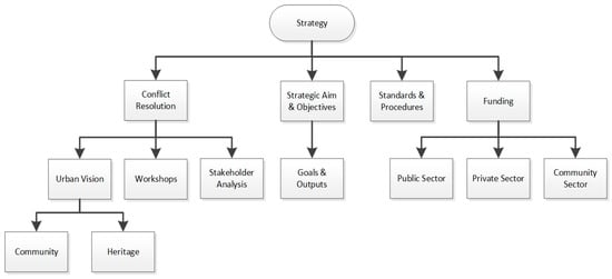 The absence of a strategic aim and objectives between stakeholders is recognised as a source of sustainable planning problems. Then, funding (40%) and conflict between stakeholders (30%) are considered as challenges in the sustainable planning process. Lastly, a lack of private investment is seen as a driver and challenge for sustainable planning problems by 20% and 30%, respectively. Lastly, the elements of the strategy formulation phase are identified as urban vision, conflict resolution, strategic aim and objectives, standards and procedures, and funding by the literature review and validated by the interview results. The relationships between elements of the formulation phase and the literature review and interview results are given in Table 4. Accordingly, the conceptual phase for strategy formulation is constructed as in Figure 4.