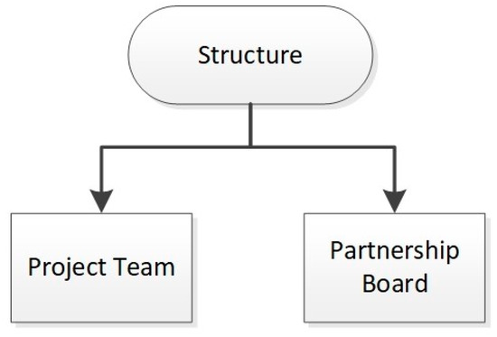 Unqualified staff were counted by 30% of all respondents as a source of sustainable planning problems. Moreover, unorganised structure was identified as a source and driver of sustainable planning problems and challenges in sustainability dimensions. Consequently, “project team” and “partnership board” are classified as the elements of the structure-organising phase, according to the relationship found in Table 5. Subsequently, the conceptual phase to organise the project structure is established and given in Figure 5.